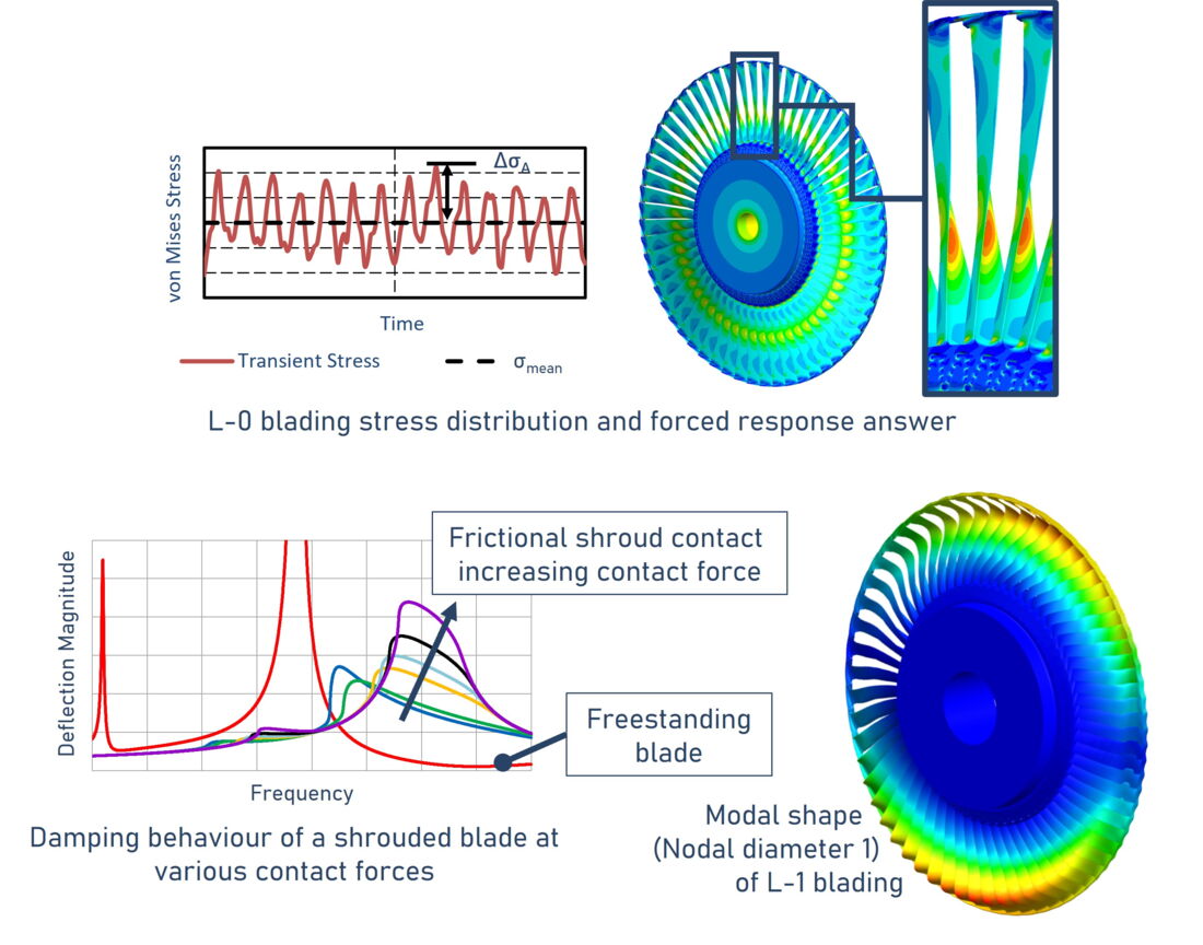 - Analysis of frictional contacts between components (e.g. root and shroud contacts of bladings)